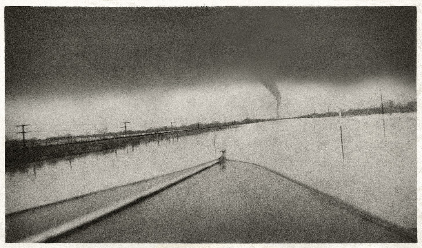 Like boxers, one a knockout artist, the other a counter puncher, these north and south combatants sparred winter long, until spring returned and the southerlies attained dominance once again. It was the wind that bore the contagion of salt from the sea, turning every metal thing exposed to it to rust. And it was the wind that gathered its forces up in the warmth of the summertime Gulf of Mexico and spun round in a mysterious danse macabre — until drunk and dizzy from the effort, it transmogrified into a demonic force, making its way erratically to shore, building up more and more strength as it smashed into the coastline with the impact of a score of Hiroshima atom bombs — devouring everything in its path.